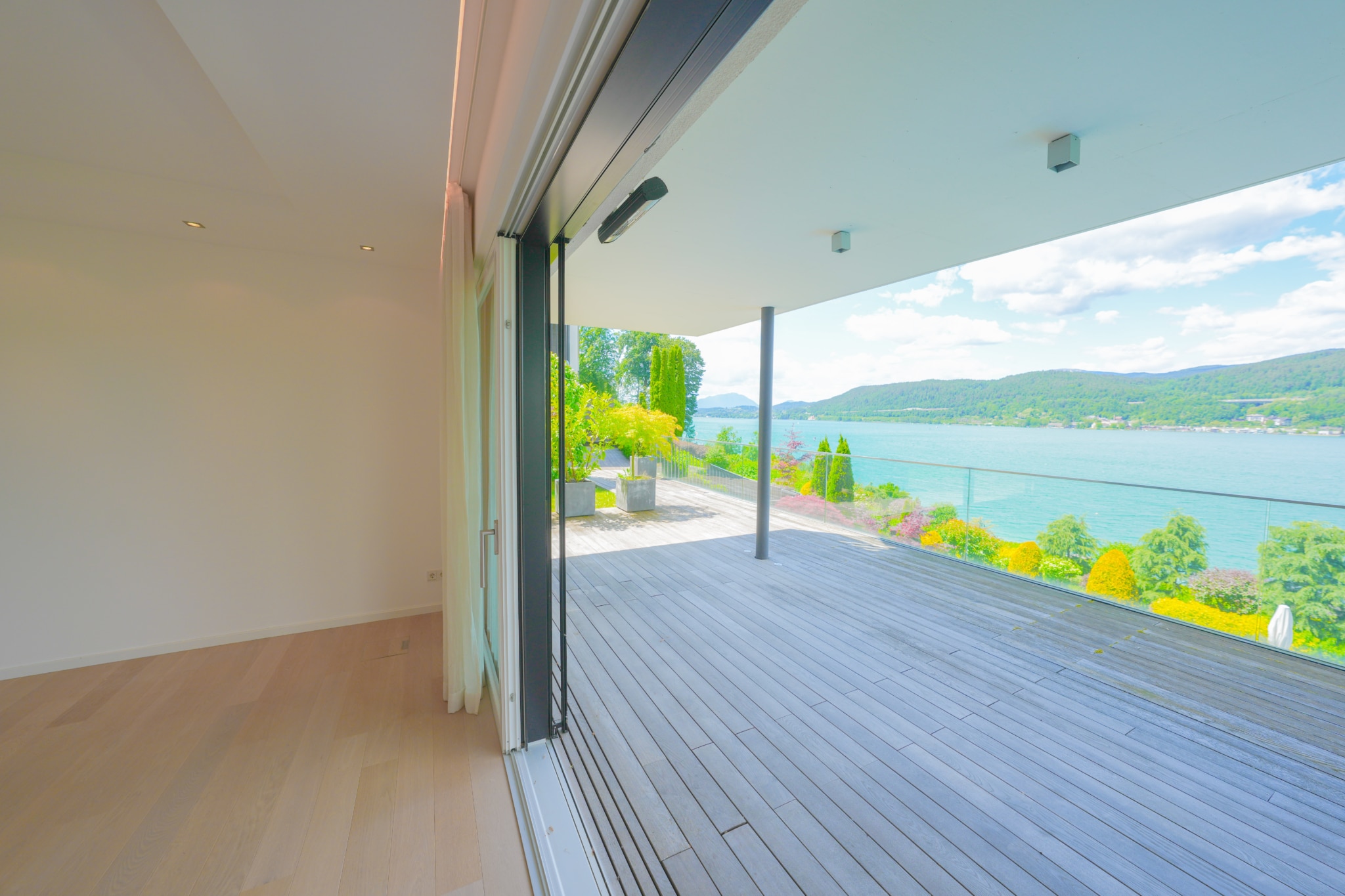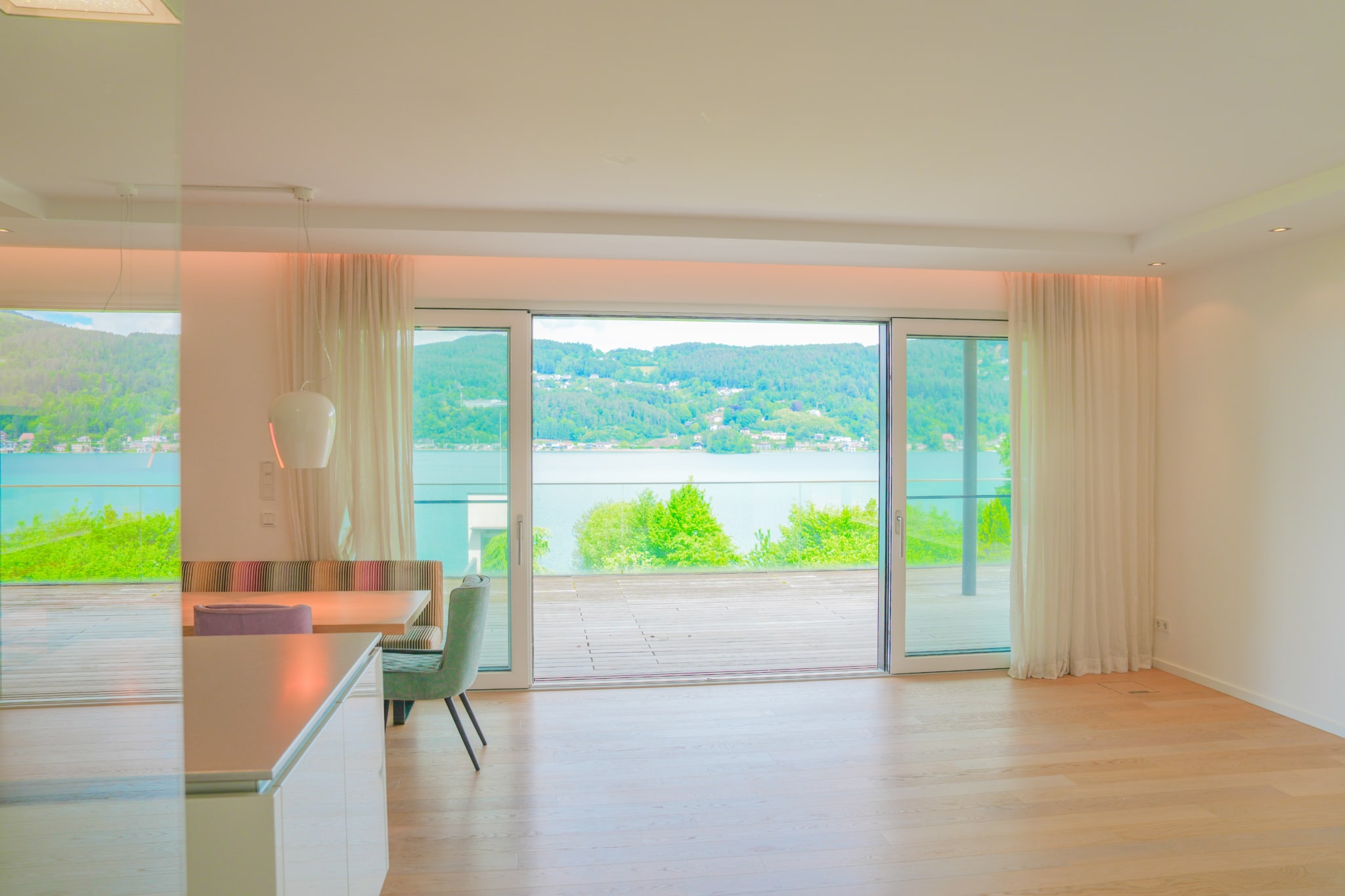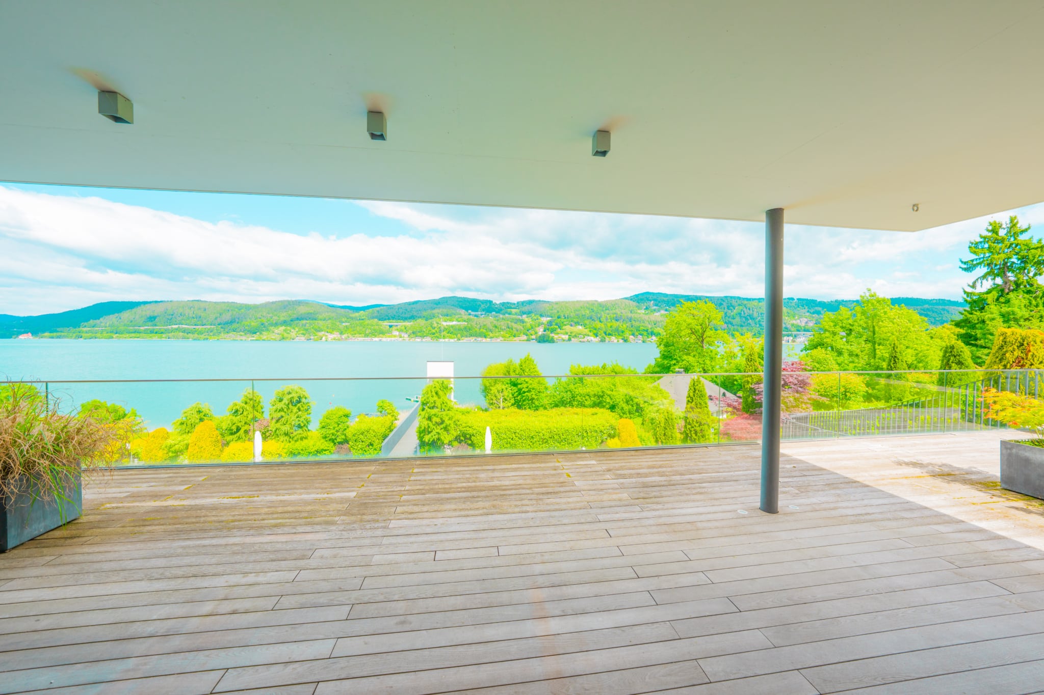 Das absolute Highlight dieses lichtdurchfluteten Seetraums ist die gigantische Seeblickterrasse (großteils überdacht), von welchem man atemberaubende Sonnenuntergänge und einen wunderschönen Wörtherseeblick genießen kann. Der angrenzende Eigengarten, welcher von allen Räumlichkeiten aus erreichbar ist, bietet genügend Gestaltungsmöglichkeiten um das facettenreiche Seeleben direkt von der Gartenseewohnung aus genießen und erleben zu können.